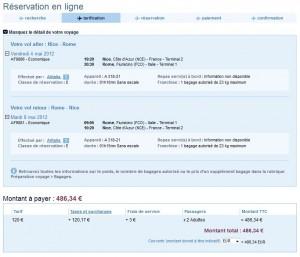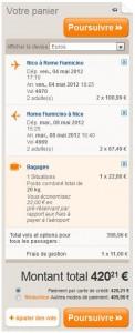 Nous avons décidé de passer le pont du 8 mai à Rome et ce toujours au départ de Nice. Le tarif easyJet pour un départ le 4 mai et un retour le 8 mai pour deux avec un bagage est de 420.21 euros mais les horaires ne sont pas forcement appropriés. Avec Air France, vol Alitalia, le prix est légèrement supérieur à 486.34 euros. Le gros avantage avec Air France sur cette destination est que, quand easyJet propose un vol par jour, Air France propose plusieurs vols afin de pouvoir profiter au maximum de votre séjour. Il est plus facile de partir un vendredi à 19 h 20 avec Air France comme dans notre exemple qu’a 17 h 10 avec easyJet pour une personne ayant un emploi avec des horaires « de bureau »…