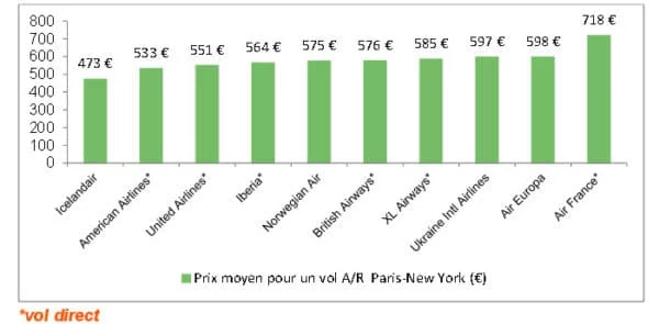 La guerre des prix fait rage sur le secteur court et moyen-courrier entre les compagnies aériennes depuis l’arrivée sur le marché des compagnies low-cost comme easyJet, Ryanair ou encore Vueling, et Volotea. Même si les compagnies aériennes ne sont pas encore très présentes sir le long courrier les prix peuvent fortement varier d’une compagnie a l’autre comme le montre l’étude réalisée par ©NewYork.