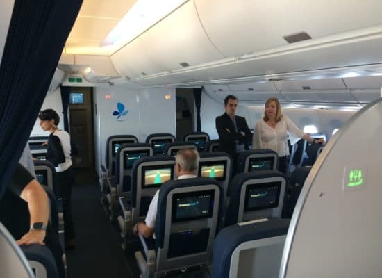 Nous ne nous attarderons pas sur l’accueil des équipes de French blue qui nous ont pris en charge et nous ont fait passer un agréable moment en leur compagnie entre vols, petits fours et champagne.